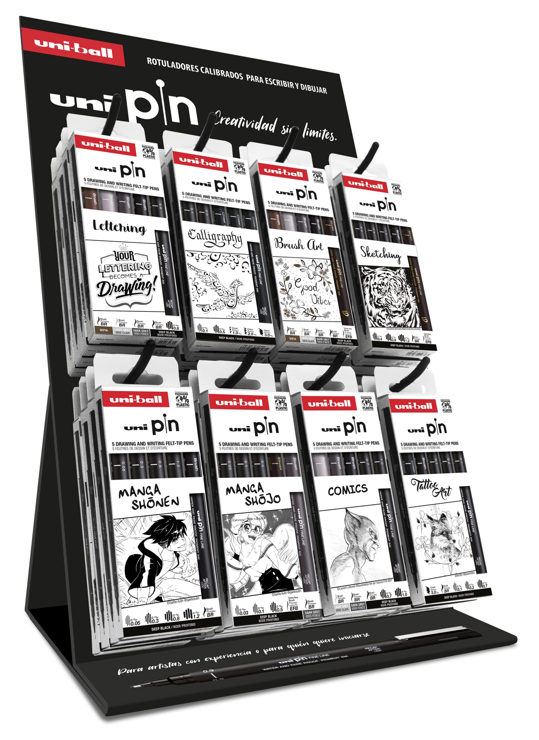 Expositor de sobremesa con ganchos con la gama completa de sets de PIN. Gama de sets especializados en diferentes técnicas de dibujo.