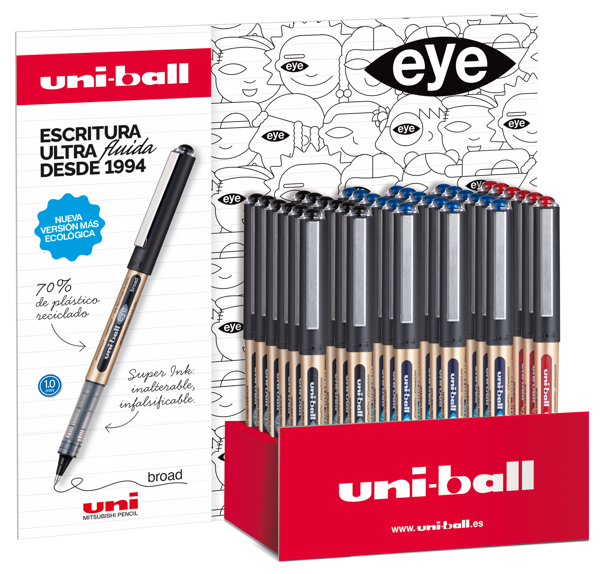 Expositor 36 unidades de Uni-ball Eye Broad: 18 azules,12 negros y 6 rojos.